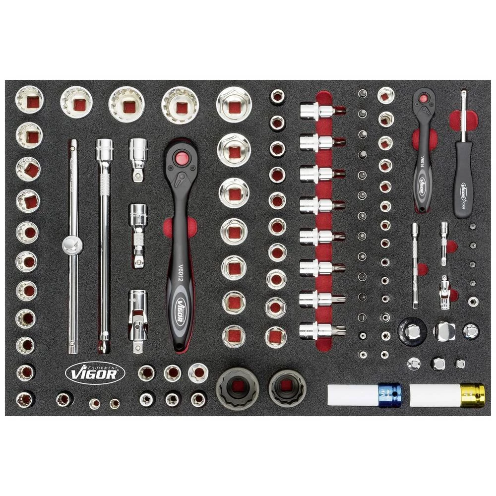 2K umetak od meke pjene Dimenzije umetka / veličina ladice: L (563 x 393 x 35 mm) VIGOR 2-komponentni umetci od meke pjene Lako se čiste: čiste pod mlazom vode i suši Nedostajući alati su odmah vidljivi zbog crvenog udubljenja Sve je u svome mjesto - savršen red Štiti alate jer su ugrađeni tako da ne mogu skliznuti Svaki alat ima svoje unaprijed definirano mjesto Otporan na ulja i masti Pogon: šuplji kvadrat 6,3 mm (1/4 inča), šuplji kvadrat 10 mm (3/8 inča), kvadratna šupljina 12,5 mm (1/2 inča), četvrtasta šuplja 20 mm (3/4 inča), kvadratna šupljina 25 mm (1 inča) izlaz: vanjski šesterokutni utični profil, vanjski šesterokutni profil, unutarnji šesterokutni profil utičnice, iznutra šesterokutni profil , Phillips profil PH, profil s utorom, šuplji šesterokutni 6,3 (1/4 inča) veličina ključa: ∙ 1 x 5,5 3 – 36 (prikaz, stručni). · E4 – E20 PH1 – PH2 T10 – T60 dimenzije / duljina: 563 mm x 393 mm x 35 mm dimenzije police / veličina ladice: L (563 x 393 mm)