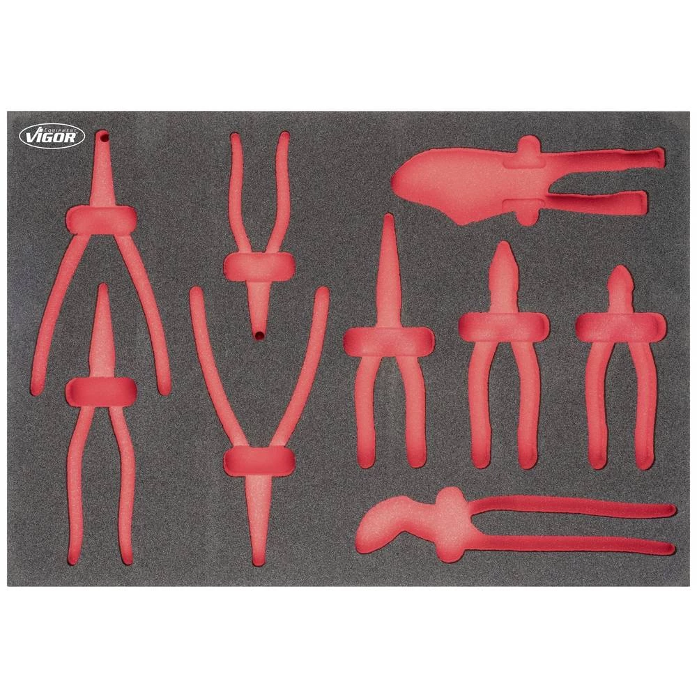 2K umetak od meke pjene Dimenzije umetka / veličina ladice: L (563 x 393 x 35 mm) VIGOR 2-komponentni umetci od meke pjene Lako se čiste: čiste pod mlazom vode i suši Nedostajući alati su odmah vidljivi zbog crvenog udubljenja Sve je u svome mjesto - savršen red Štiti alate jer su ugrađeni na neklizajući način Svaki alat ima svoje unaprijed definirano mjesto Otporan na ulja i masti Dimenzije / duljina: 563 mm x 393 mm x 35 mm