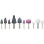 Brusno kamenje za VIGOR brusilice V6906 ∙ V5672 ∙ V5673 10 komada: 5 brusnih kamena s držačem od 6 mm 5 brusnih kamena s držačem od 3 mm Kugla: ⌀ 12 i 22 mm Okrugli konus: ⌀ 12 i 1⌀ mm 12 i 1 12 mm. Cilindar: ⌀ 12 i 24 mm ravni konus: ⌀ 19 mm