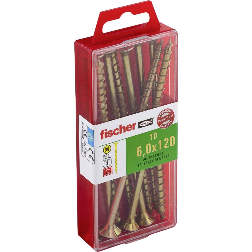 Fischer Power-Fast FPF-ST YZP je galvanizirani, žuti pasivizirani vijak s djelomičnim navojem i poprečnim udubljenjem. Upuštena glava omogućuje ugradnju u drvo. Izvedba s djelomičnim navojem omogućuje fiksno spajanje drvenih elemenata. Vijak je prikladan za učvršćivanje nosivih dijelova u presvučeno drvo, tvrdo drvo, meko drvo i drvene spojeve. Na primjer, u nadstrešnicama i balkonima.