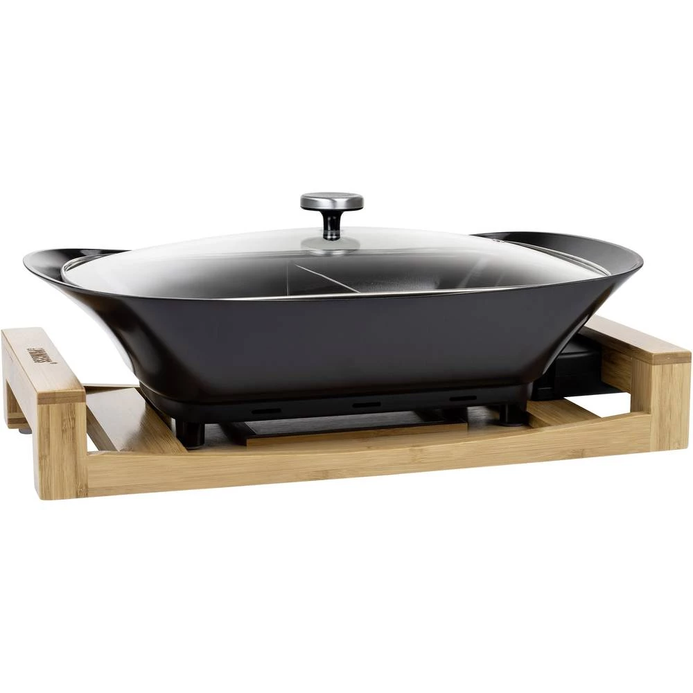 Lijepo dizajnirana tava s bambusovim kućištem. Višenamjenski lonac opremljen je keramičkim premazom otpornim na ogrebotine i ima dva pretinca za istodobnu pripremu različitih jela.