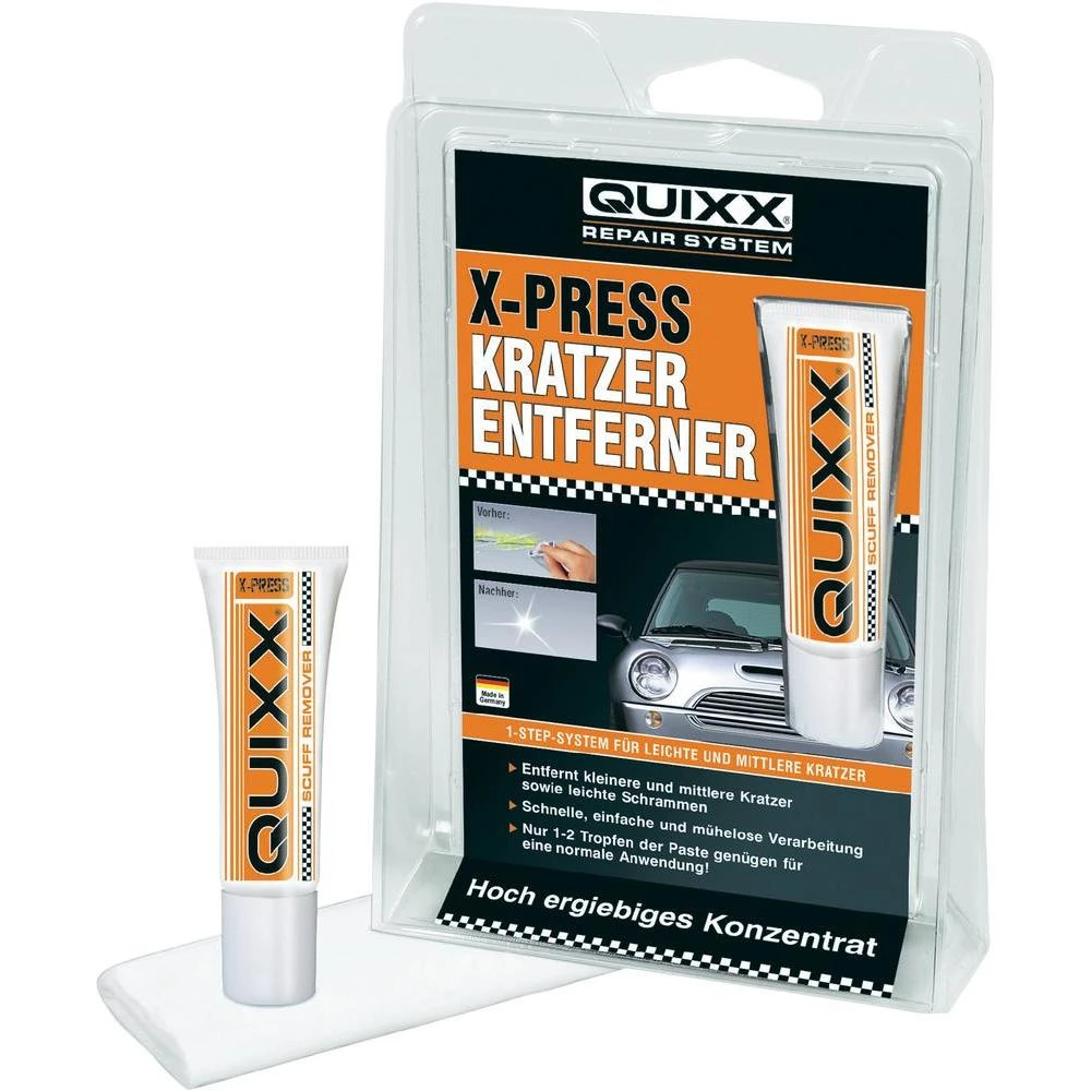 je pogodan za sve sjajne lakove (također i metalik) QUIXX X-Press odstranjivač ogrebotina nudi jednu povoljnu alternativu za male i srednje male ogrebotine kao dvo komponentni QUIXX lak odstranjivač