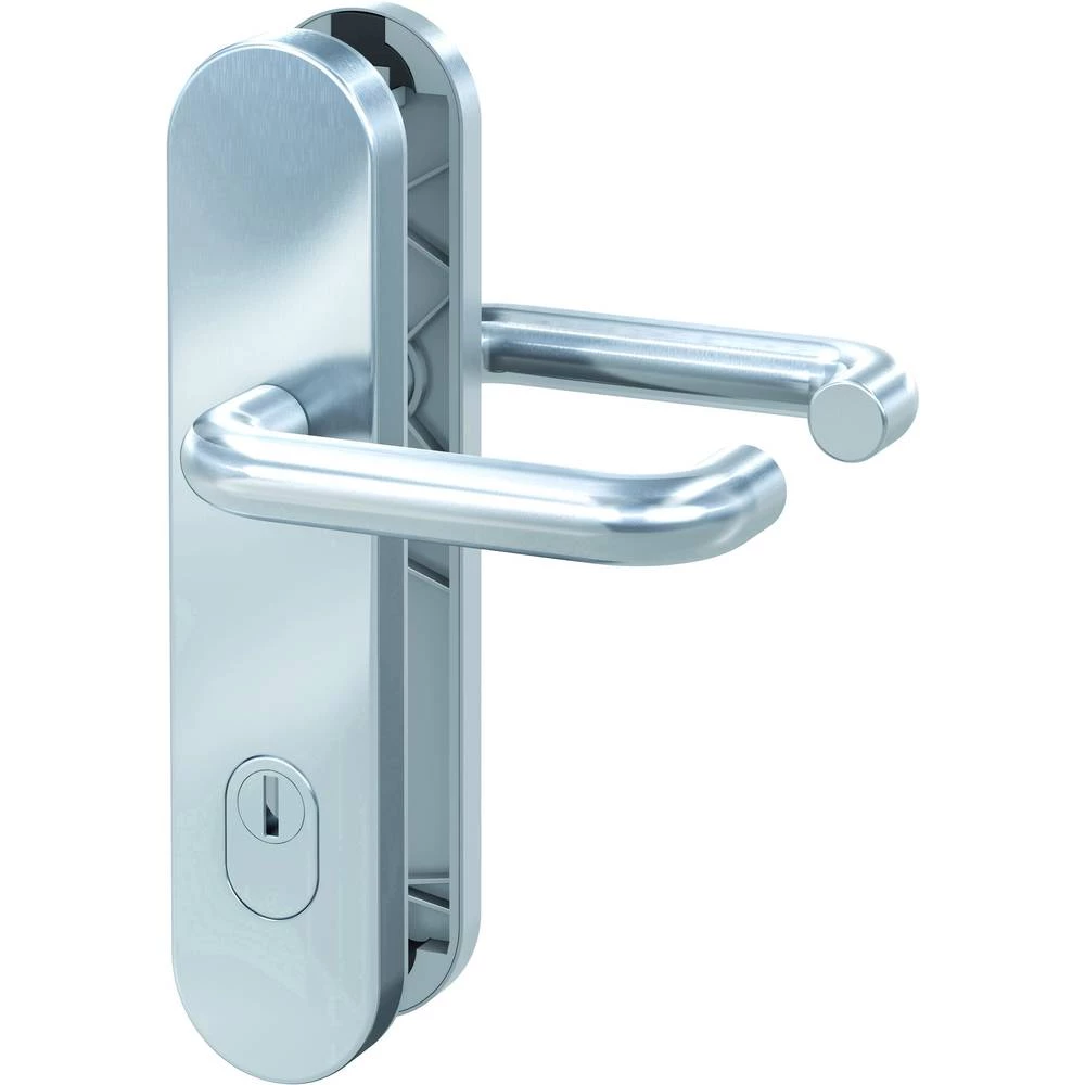SB 7200 - ES2 ZA 92/10 mm Sigurnosna armatura od nehrđajućeg čelika, nevidljiva vijčana veza, komplet potisnika (potisni U-oblik), dugačka ploča okrugla, debljina ploče 15 mm, za debljinu vrata 38-54 mm, prevrtanje cilindra 14-18 mm, ispitano prema DIN 18257 / RAL-RG607 / 6, test br. 9-6 / 16, 3V68